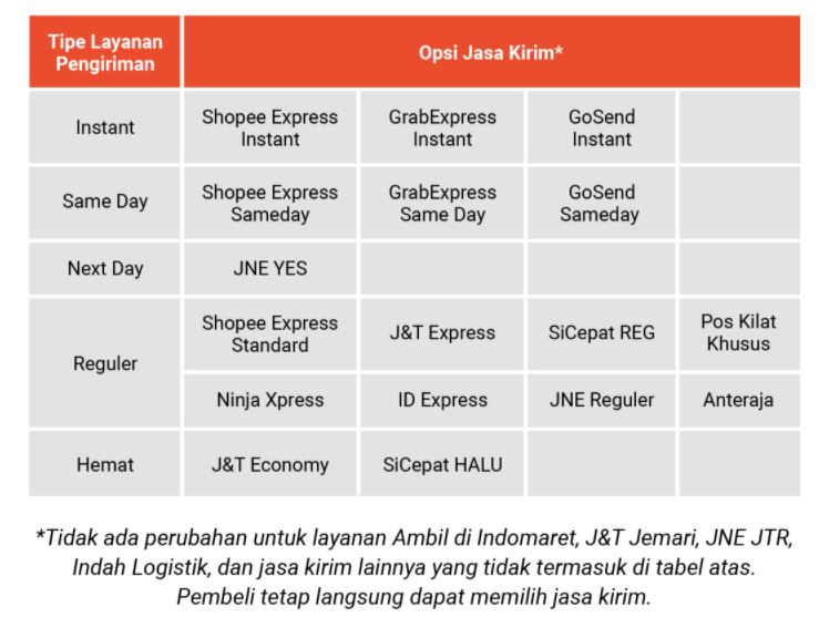 Terdapat lima tipe pengiriman yang dapat dipilih pembeli saat checkout yaitu Instant, Sameday, Nextday, Reguler dan Hemat. Tipe pengiriman ini akan muncul berbeda-beda di tiap toko/penjual tergantung dari jasa kirim yang diaktifkan oleh tiap penjual. Berikut adalah opsi jasa kirim yang tersedia untuk masing-masing tipe layanan pengiriman.